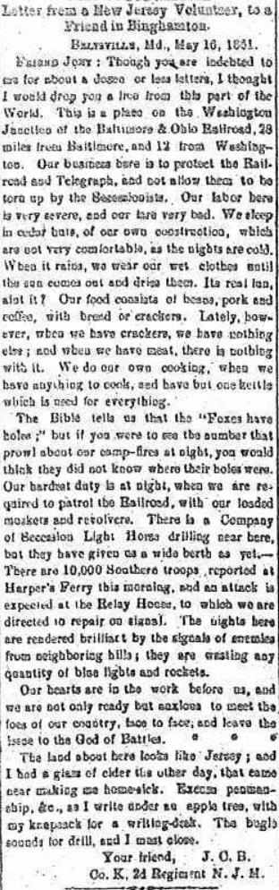 FRIEND JONY: Though you are indebted to me for about a dozen or less letters, I thought I would drop you a line from this part of the World. This is a place on the Washington Junction of the Baltimore & Ohio Railroad, 28 miles from Baltimore,and 12 from Washington. Our business here is to protect the Railroad and Telegraph, and not allow them to be torn up by the Secessionists. Our labor here is very severe, and our fare very bad. We sleep in cedar huts, of our own construction, which are not very comfortable, as the nights are cold. When it rains, we wear our wet clothes until the sun comes out and dries them. Its real fun, aint it? Our food consists of beans, pork and coffee, with bread or crackers. Lately, however, when we have crackers, we have nothing else; and when we have meat, there is nothing with it. We do our own cooking, when we have anything to cook, and have but one kettle which is used for everything.