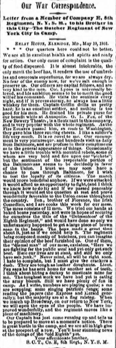 Edwin J. Scrantom, an apprentice in this office during the past year, but now a member of Company G, Washington Greys, 8th Regiment, on their way to the seat of War, has written a letter to a friend in Middletown, giving his 'experience’ of army life. We make some ex- tracts, He says the troops are (May 7th) encamped at Jack’s Bridge, eight miles from Baltimore, where there are 5,000 of them. One of the men in drawing a load from his gun that morning was accidentally killed. As to provender, he says they have salt pork, hard crackers, and coffee without milk. A night or two previous himself and another guard on duty 'surrounded' a prisoner.